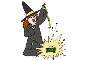 Hexe, Zaubertrank, Zauberkugel, Zauberkessel und Frosch. |